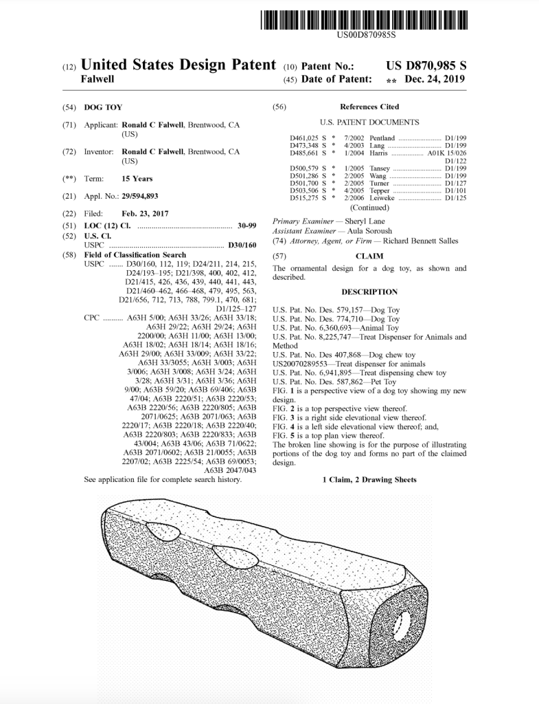 https://patents.google.com/patent/USD870985S1/en?q=DOG+TOY+FALWELL&oq=DOG+TOY+FALWELL