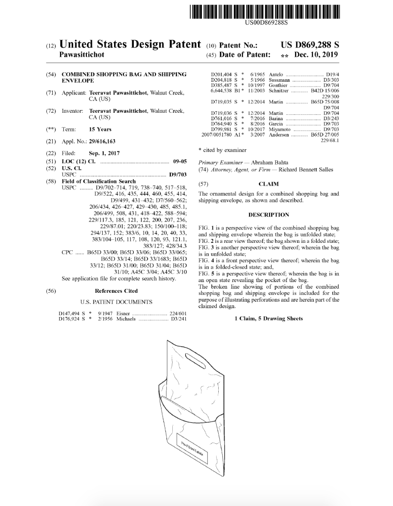 https://patents.google.com/patent/USD869288S1/en?q=COMBINED+SHOPPING+BAG+%26+SHIPPING+ENVELOPE&type=DESIGN